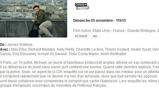 Film Bastille Day sur CANAL+DECALE en fin de matinée sur FreeboxTV