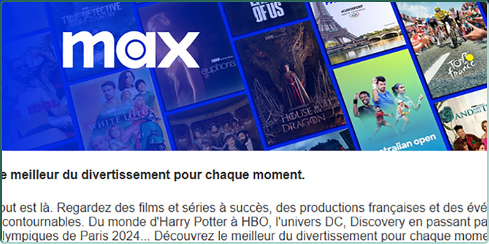 « Regardez des films et séries à succès, des productions françaises et des événements sportifs incontournables. Du monde d’Harry Potter à HBO, l’univers DC, Discovery en passant par l’intégralité des Jeux Olympiques de Paris 2024. Découvrez le meilleur du divertissement pour chaque moment et pour chaque membre de votre foyer avec Max. »