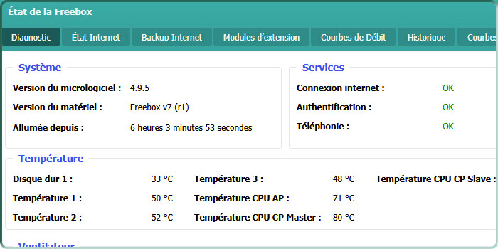 Se trouve dans la rubrique « État de la Freebox ». Le tout premier onglet « Diagnostic » permet de visualiser tout de suite la version du micrologiciel utilisé par la Freebox.